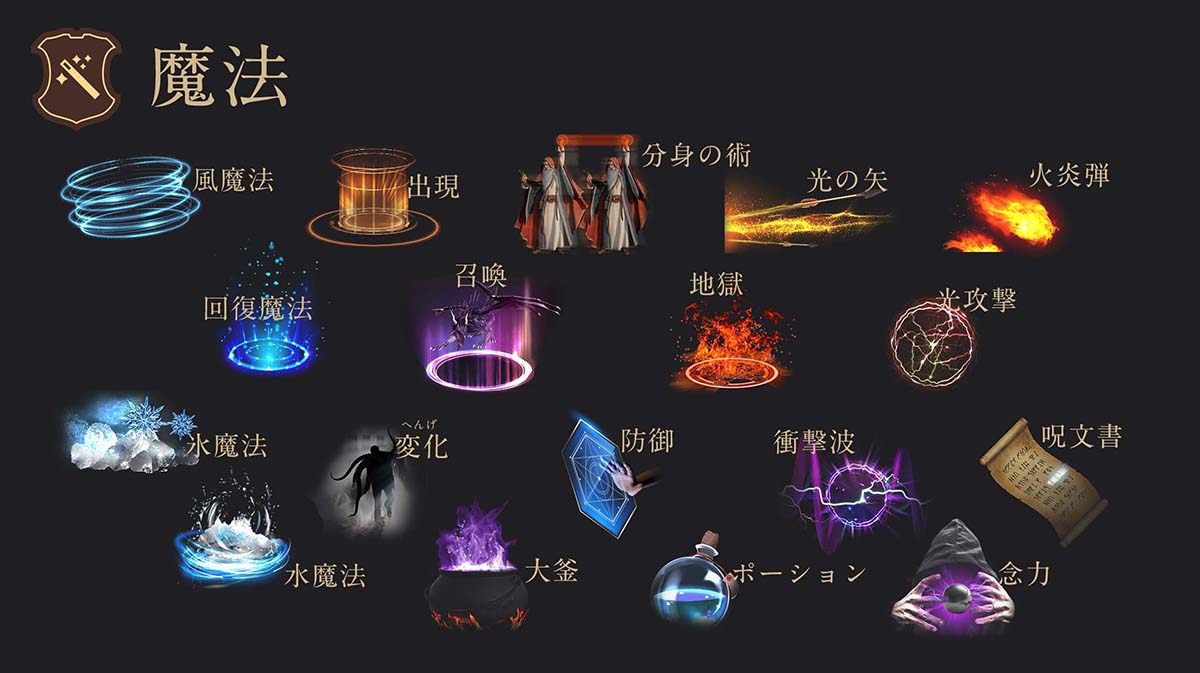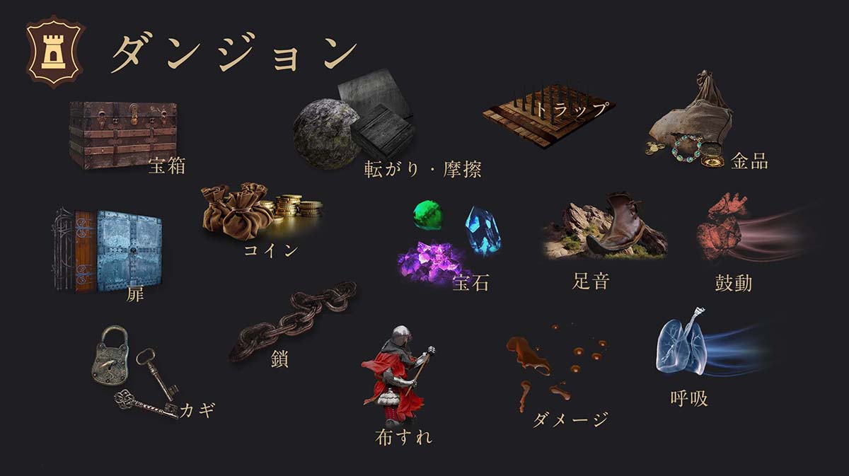 「クリーチャー」「ダンジョン」「環境音」「アイテム」「魔法」「武器」と、ファンタジー世界でおなじみの効果音モデルを複数搭載!