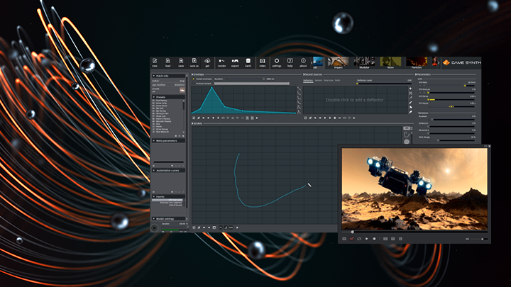 GameSynth comes with specialized synthesizers full of unique features, such as Impact, Whoosh, Particles, Footsteps, Weather etc.. GameSynth is modular and extensible. New synthesizers are constantly added, and they come entirely free with each GameSynth update! GameSynth is also a platform: companies and researchers are adding their own procedural audio models to the GameSynth environment, like Sound Design Lab with their Engines model.